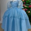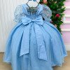 Elegância e encanto em cada detalhe!Este vestido longo foi criado para brilhar em momentos especiais. O busto apresenta bordados florais com fios de brilho, que combinam perfeitamente com o tule transparente superior, formando um decote suave e delicado. As mangas bufantes em tule bordado dão um toque romântico e sofisticado. Na cintura, o modelo vem com cinto de pérolas que realça a silhueta e adiciona um charme clássico. A saia tem camadas de tule com leve brilho, criando movimento e um caimento leve e encantador. Na parte de trás, o destaque vai para o lindo laço volumoso em tecido acetinado e o lastex central, que garante conforto e ótimo ajuste ao corpo. Principais detalhes: Cor: Azul Bebe Tecido: Tule com brilho, forro leve e bordado floral Manga: Bufante em tule bordado Cintura: cinto de pérolas Saia: Três camadas fluidas de tule com brilho Costas: Lastex central e laço grande Comprimento: Longo Perfeito para: daminhas, batizados, aniversários, ensaios fotográficos e eventos especiais. Informações Importantes As medidas podem variar em até 2cm. Recomendamos sempre consultar a tabela de medidas antes da compra para evitar erros. Tecido Tecnosport 100% poliester Para um volume extra, indicamos o uso de saiote de armação, vendido separadamente na categoria Acessórios. Tiara e outros acessórios não acompanham o produto, mas estão disponíveis em nosso site. Calçado vendido separadamente, disponível na categoria Calçados As cores do produto podem sofrer variações de tonalidade conforme a configuração da tela do seu dispositivo.