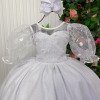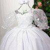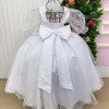 Elegância e encanto em cada detalhe!Este vestido longo foi criado para brilhar em momentos especiais. O busto apresenta bordados florais com fios de brilho, que combinam perfeitamente com o tule transparente superior, formando um decote suave e delicado. As mangas bufantes em tule bordado dão um toque romântico e sofisticado. Na cintura, o modelo vem com cinto de pérolas que realça a silhueta e adiciona um charme clássico. A saia tem camadas de tule com leve brilho, criando movimento e um caimento leve e encantador. Na parte de trás, o destaque vai para o lindo laço volumoso em tecido acetinado e o lastex central, que garante conforto e ótimo ajuste ao corpo. Principais detalhes: Cor: Branco Tecido: Tule com brilho, forro leve e bordado floral Manga: Bufante em tule bordado Cintura: cinto de pérolas  Saia: Três camadas fluidas de tule com brilho Costas: Lastex central e laço grande  Comprimento: Longo    Perfeito para: daminhas, batizados, aniversários, ensaios fotográficos e eventos especiais. Informações Importantes  As medidas podem variar em até 2cm. Recomendamos sempre consultar a tabela de medidas antes da compra para evitar erros. Tecido Tecnosport 100% poliester Para um volume extra, indicamos o uso de saiote de armação, vendido separadamente na categoria Acessórios. Tiara e outros acessórios não acompanham o produto, mas estão disponíveis em nosso site. Calçado vendido separadamente, disponível na categoria Calçados As cores do produto podem sofrer variações de tonalidade conforme a configuração da tela do seu dispositivo.