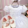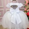 Confeccionado em tecido misto possui forro em poliéster e algodão para não incomodar a criança e proporcionando um caimento incrível e sofisticado, possui gola redonda, comprimento médio, mangas curtas, apliques de laço e perolás,  contém, também, elástico nas costas para melhor ajuste, acabamento com lindo laço na parte posterior do vestido completa o look dos sonhos!   * Medidas podem variar em até 4cm. * Caso queira o vestido mais armado, recomendamos o uso do saiote ou anágua de armação, disponível no nosso site na categoria acessórios. * Tiara vendida separadamente, disponível em nosso site na categoria acessórios. * Calçados vendido separadamente, disponível em nosso site na categoria calçados.   * LEMBRANDO QUE PODERA HAVER VARIAÇÃO DE TONALIDADE DO PRODUTO DEPENDENDO DA TELA DO SEU DISPOSITIVO